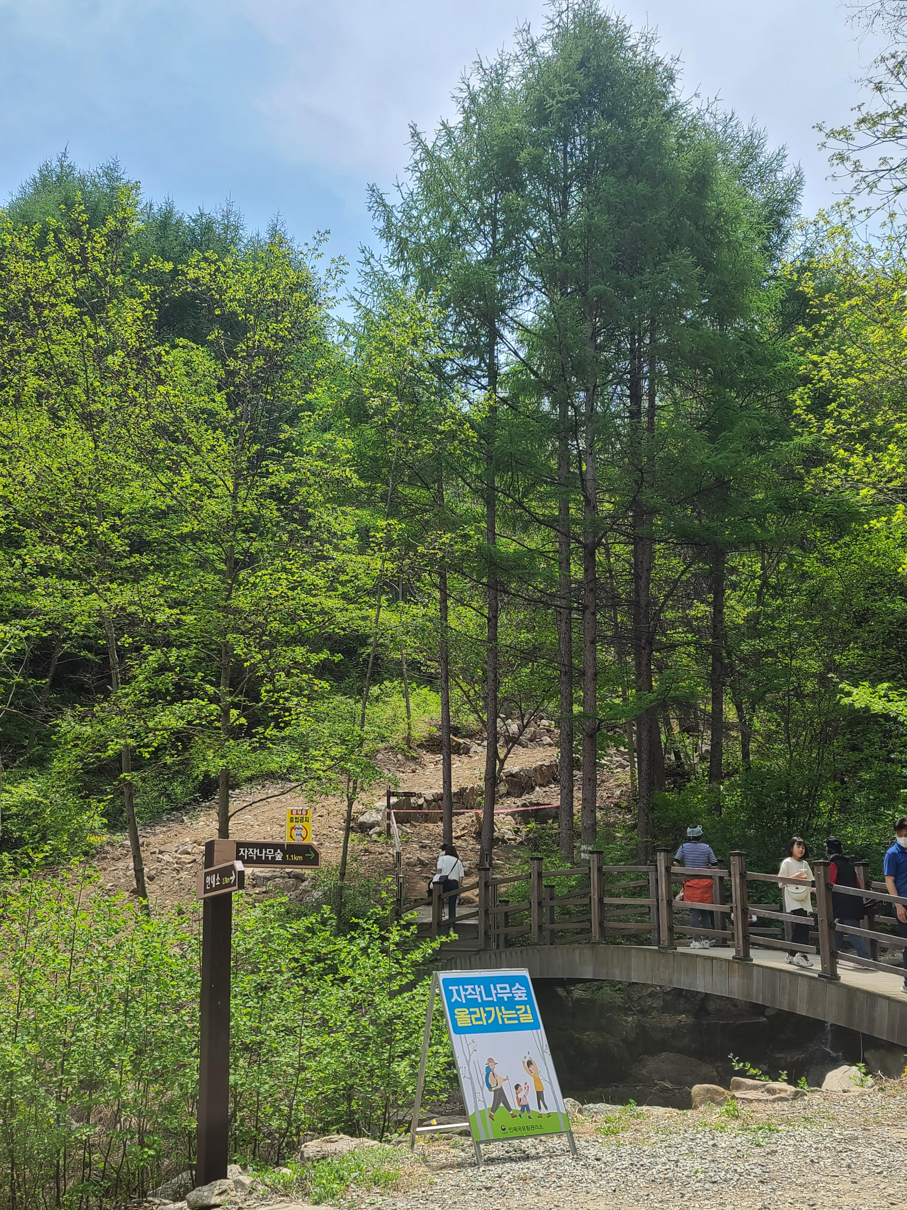 아랫길을 따라 천천히 오솔길을 걷다 보면 남은 거리 1.1km를 알리는 이정표가 나온다. 이정표 앞 나무다리를 건너면서 바위로 뒤덮인 가파른 등산로가 나온다. 계곡을 따라 걷다 보면 울창한 숲과 계곡 물소리와 새소리만이 들린다. 헉헉 거리며 1시간 30분가량 걸어 땀이 비 오듯 쏟아질 때쯤 울창한 자작나무 숲을 마주한다